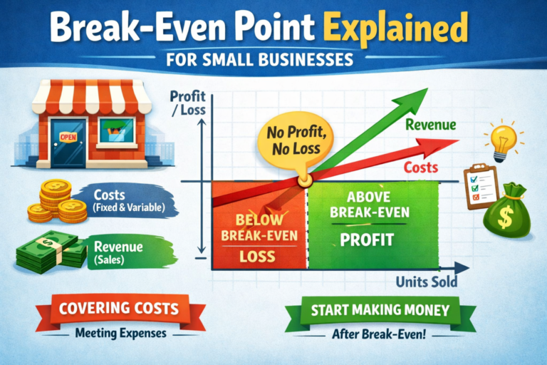 Blogs Break-Even Point Explained for Small Businesses March 1, 2026March 1, 20260 Let’s start with a simple question. Have you ever wondered: “How much do I need to sell just to stop…